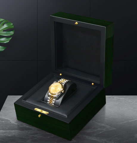 "Elevate your watch collection to elite status with our Ebon Elite Lacquered Watch Case. The deep ebon lacquer finish captures a sense of luxury and exclusivity. Inside, your watches rest securely, enveloped in elegance."