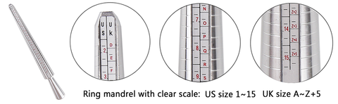Ring sizer mandrel include 4 types of measure scales: UK, US, EU, FR;